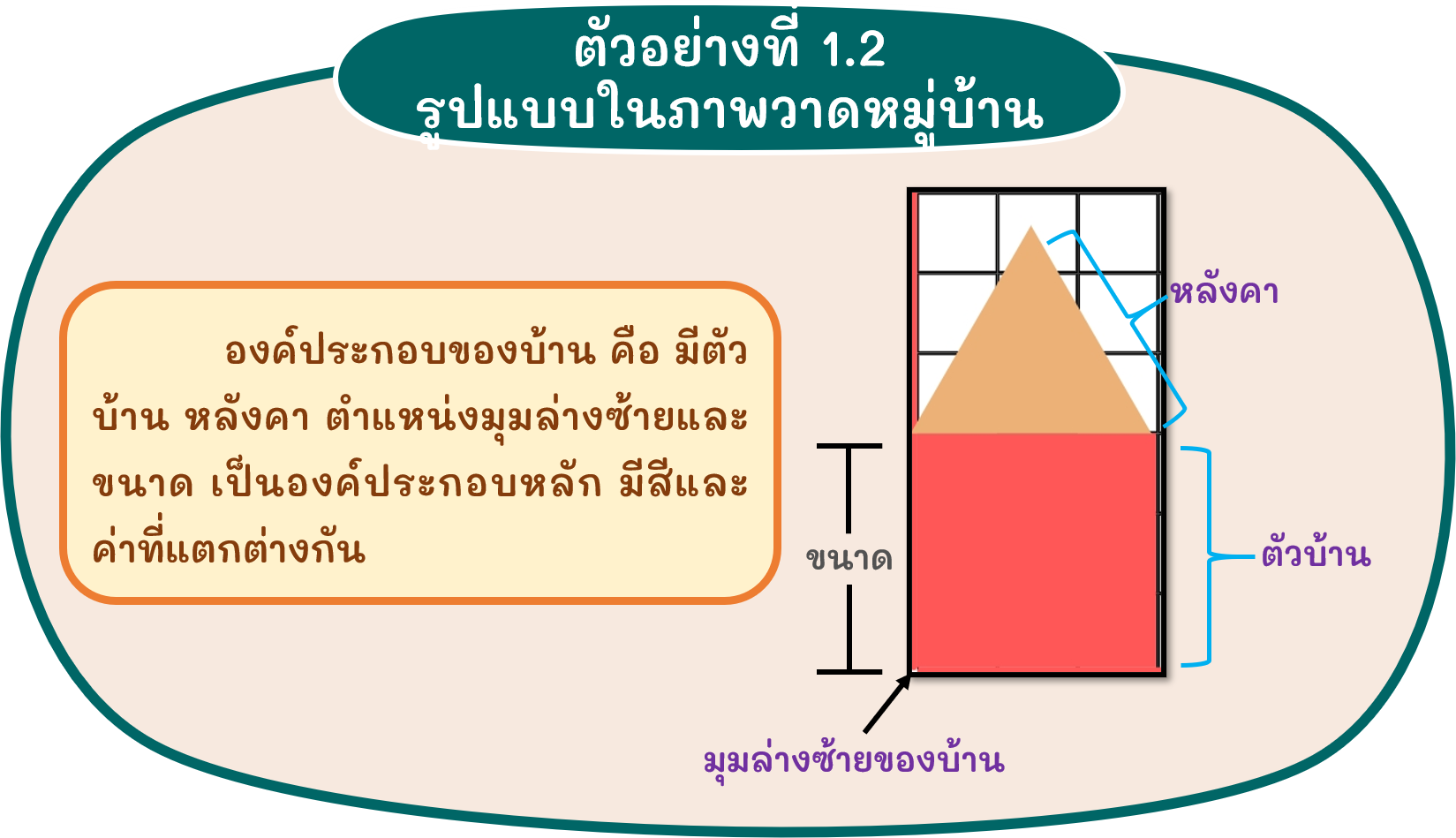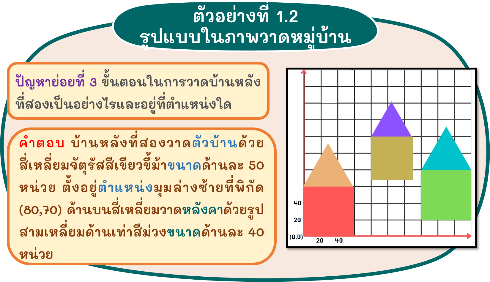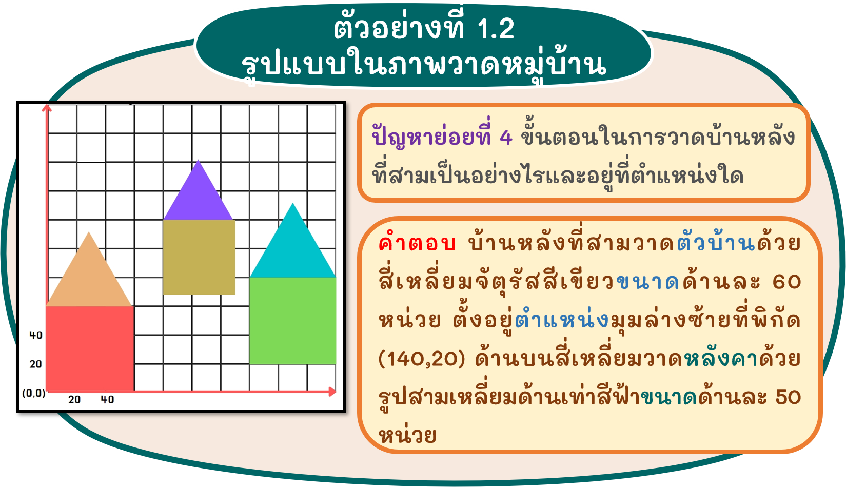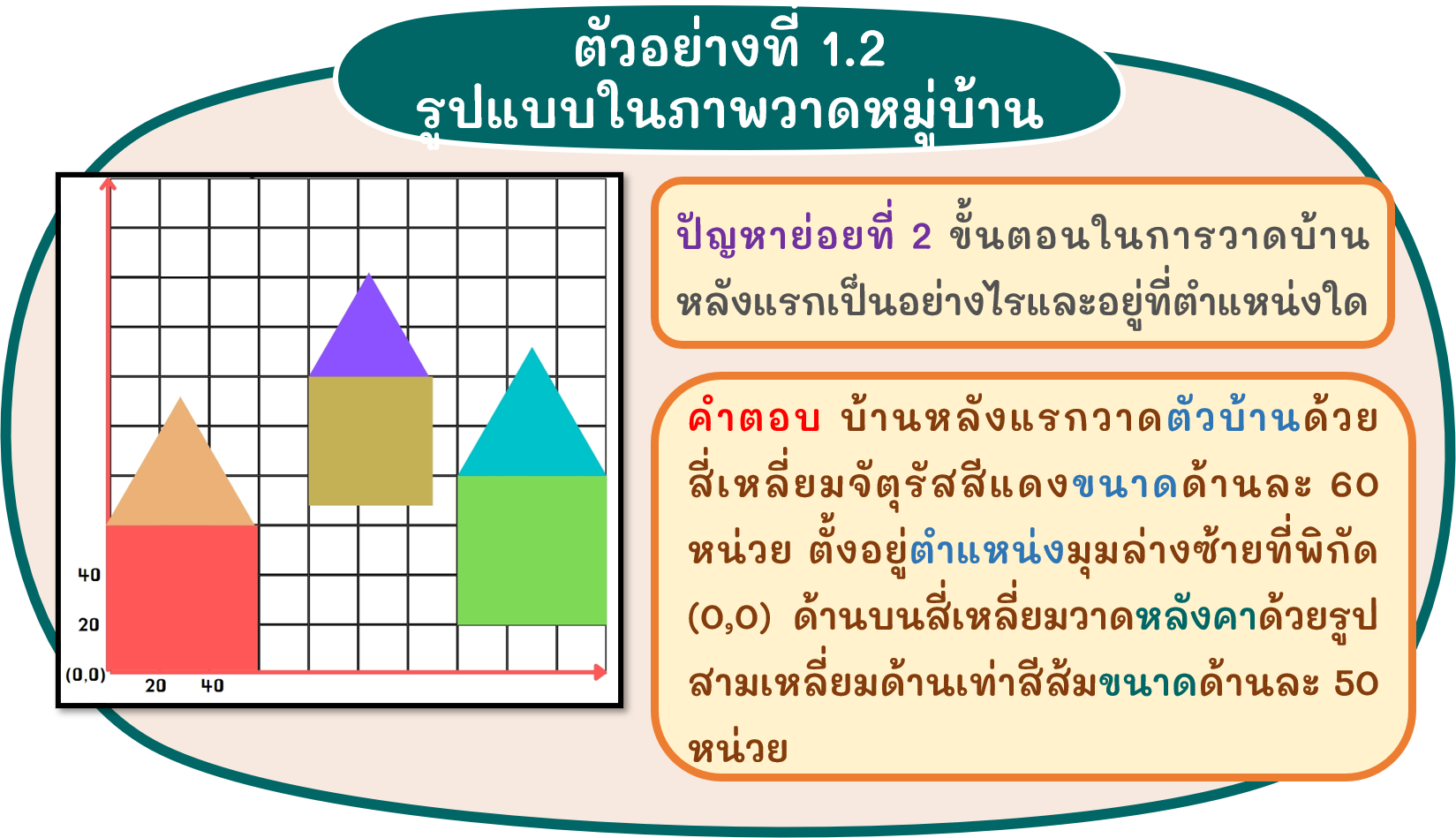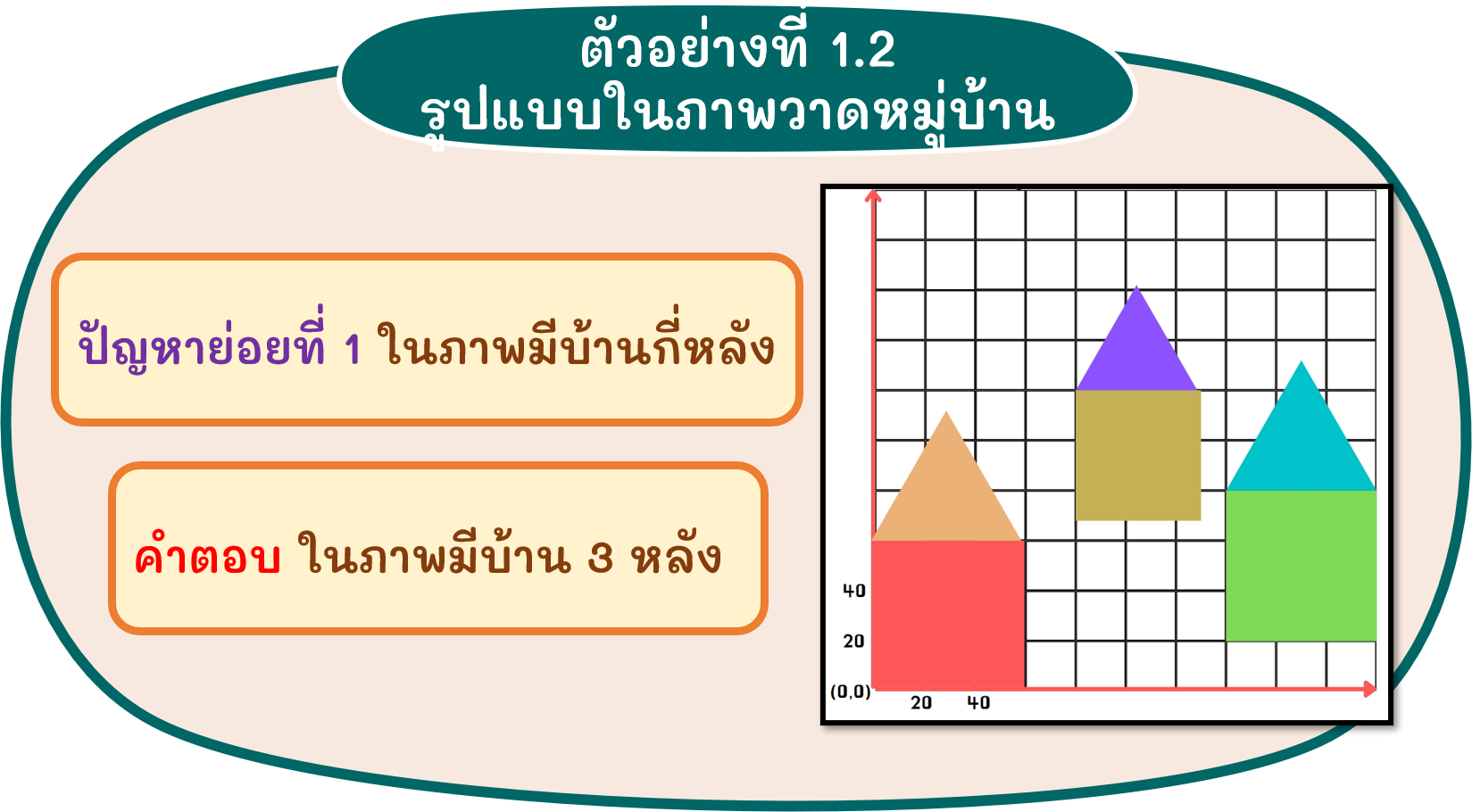 จากปัญหาภาพวาดในตัวอย่างที่ 1.1 นักเรียนอาจจะอธิบายคำตอบของปัญหาย่อยได้ดังนี้